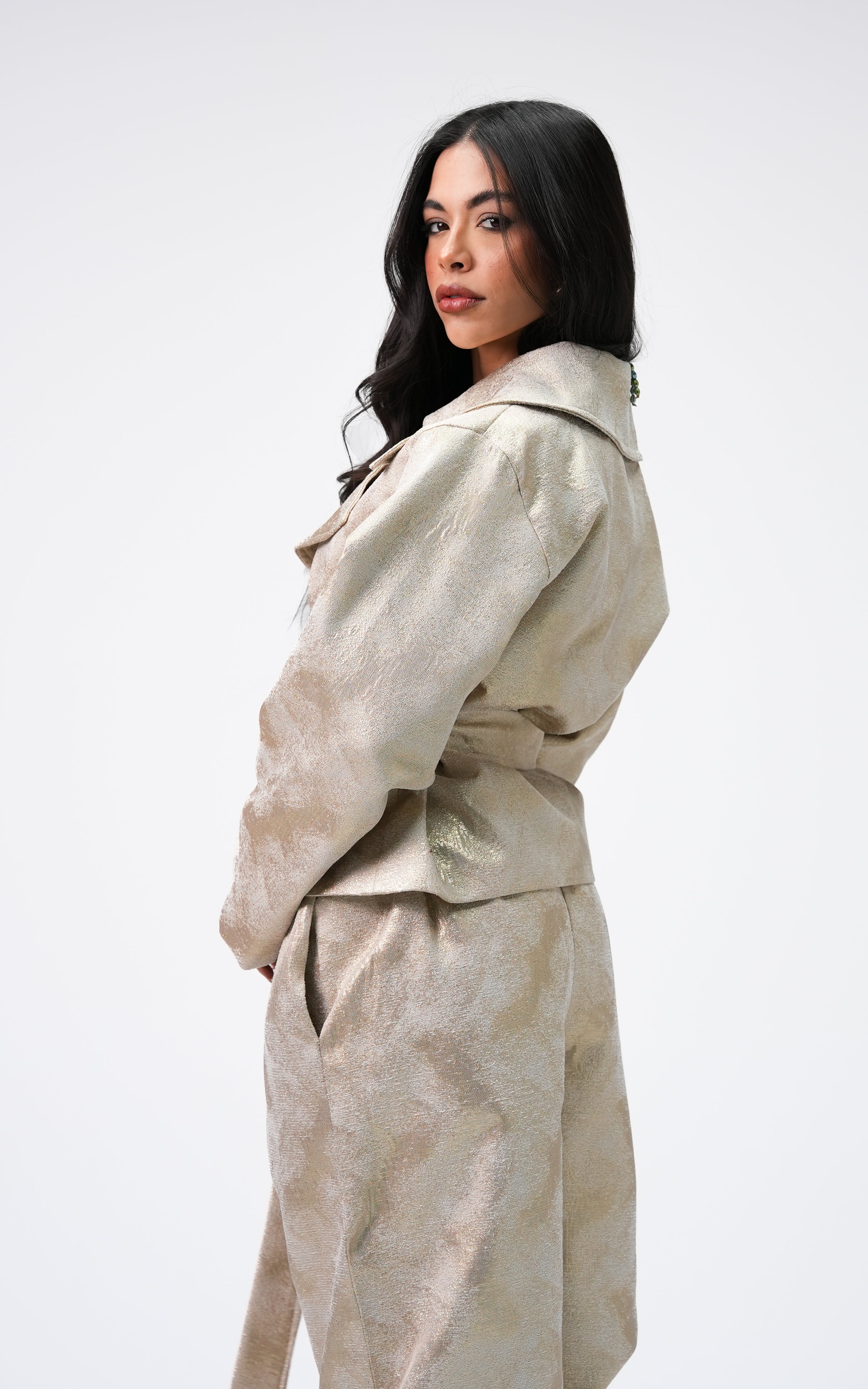 Aziza is a brocade set featuring a structured jacket with a belted waist and relaxed-fit pants. Designed with clean lines and a refined silhouette, it offers an elegant balance between structure and ease.