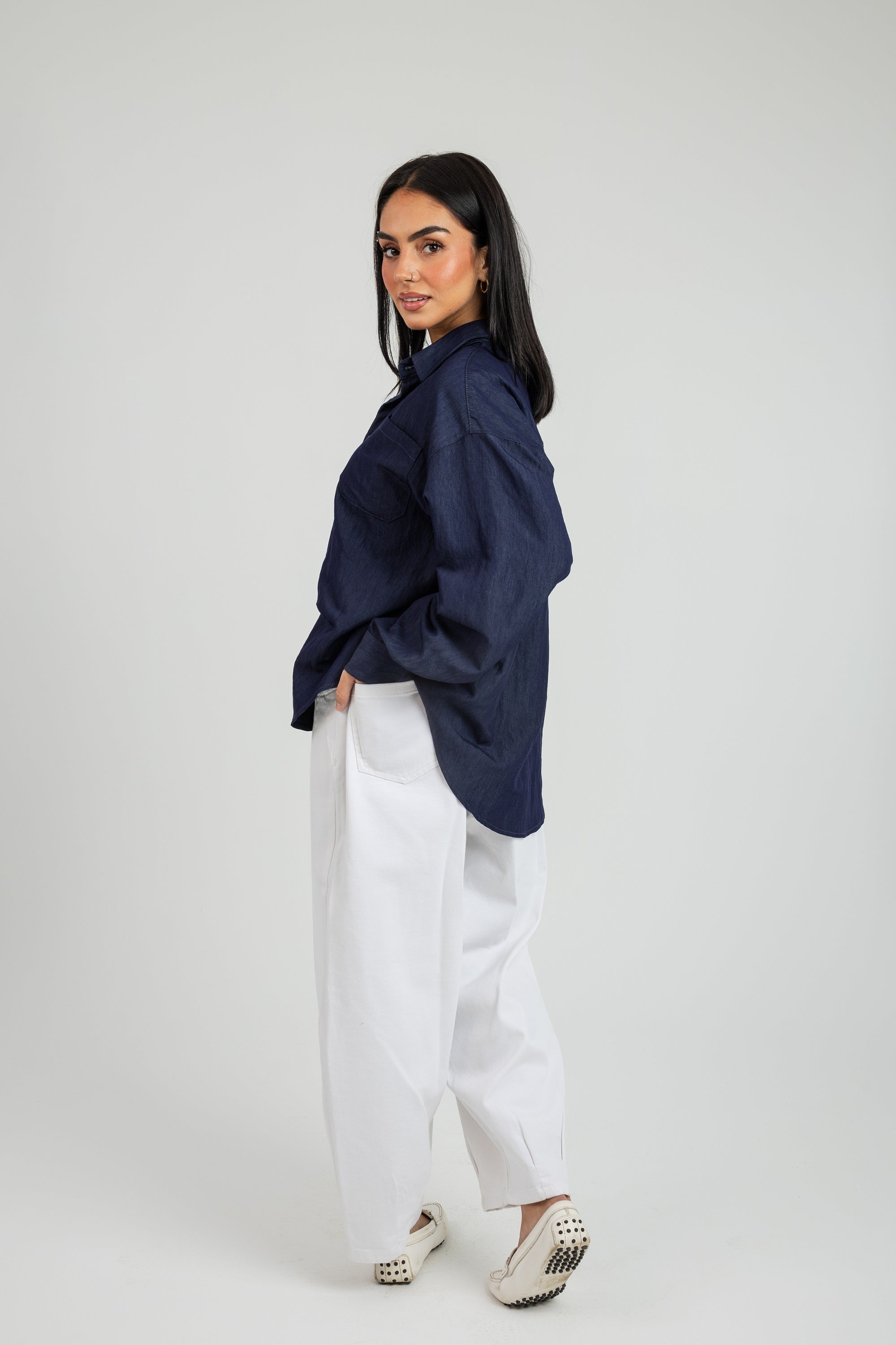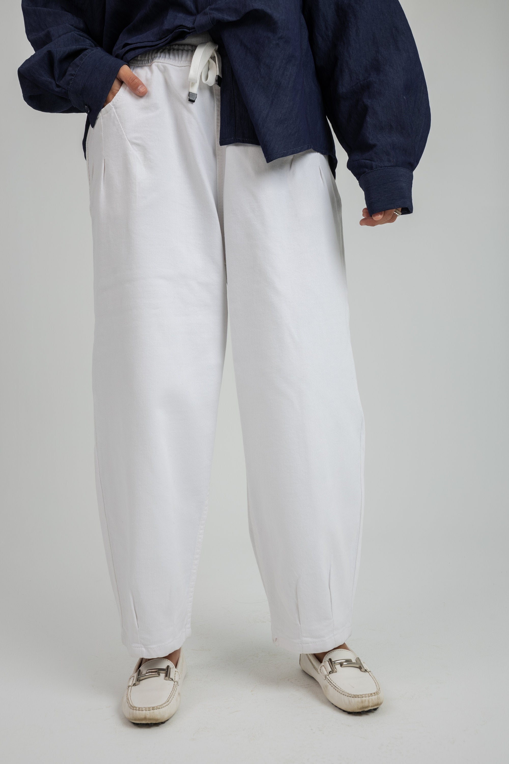 The Ego Pants are a pair of white denim trousers featuring a clean, wide-leg silhouette. Designed for a comfortable and structured look, these pants offer a modern aesthetic that pairs effortlessly with any top for a refreshed, everyday style.