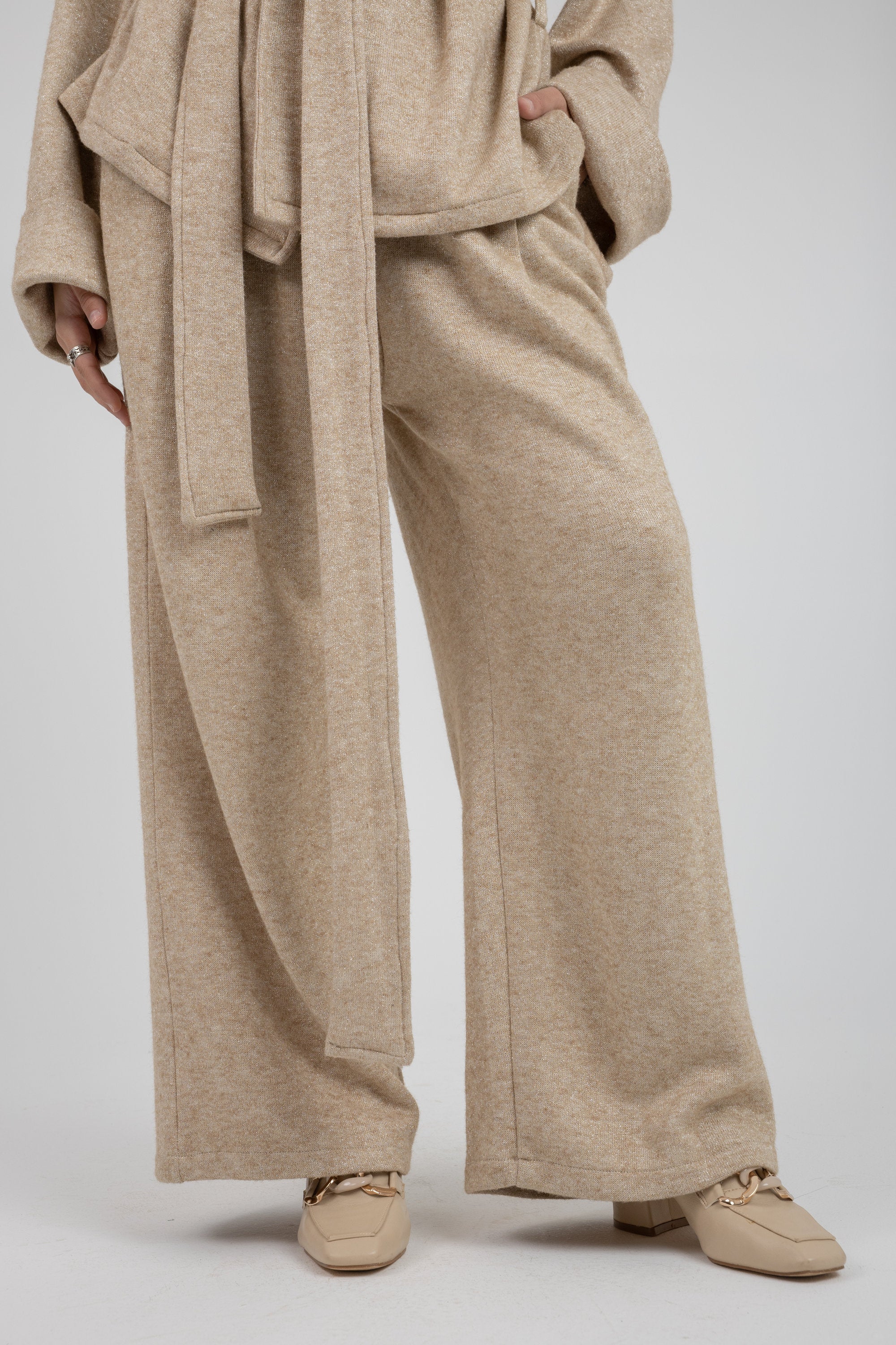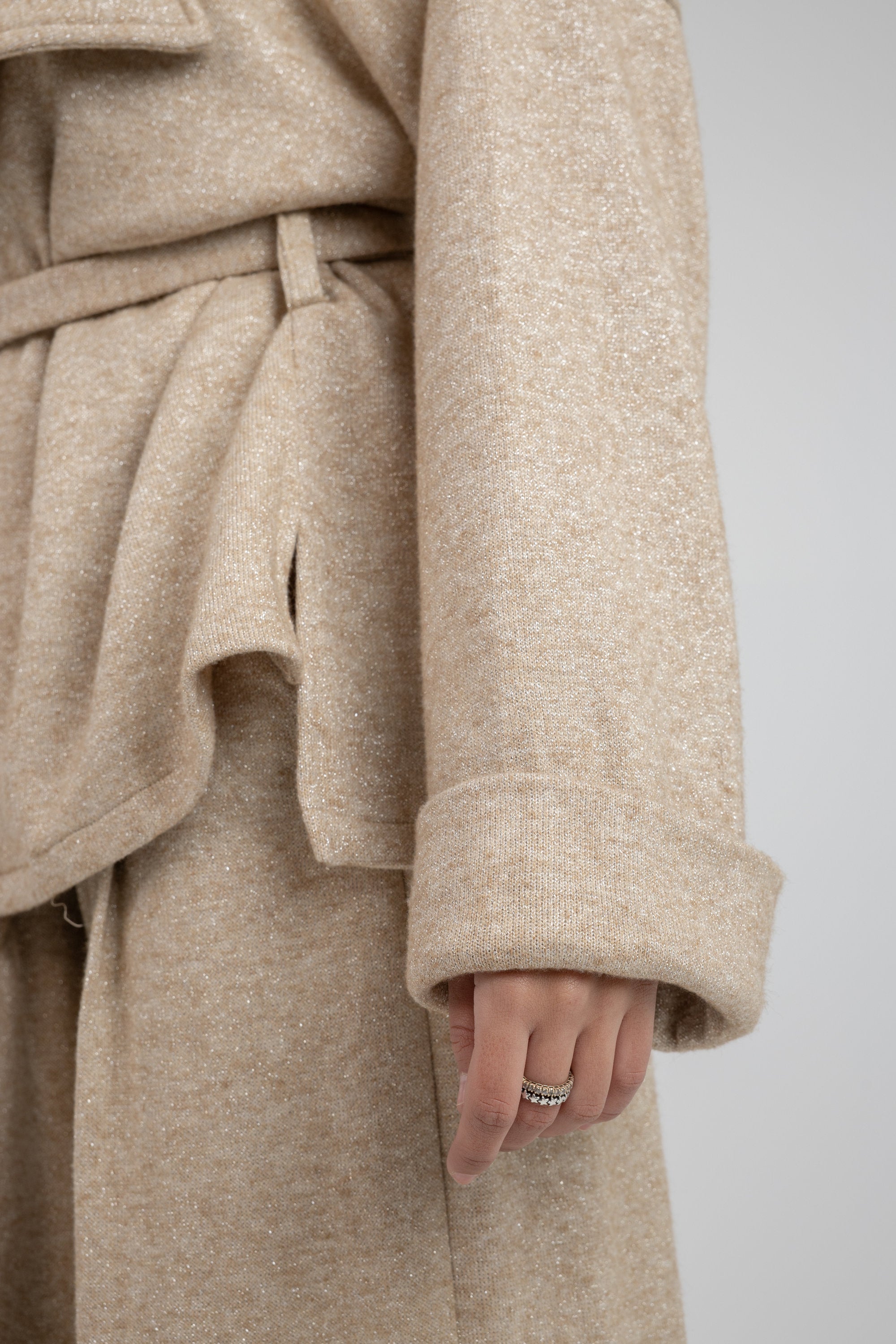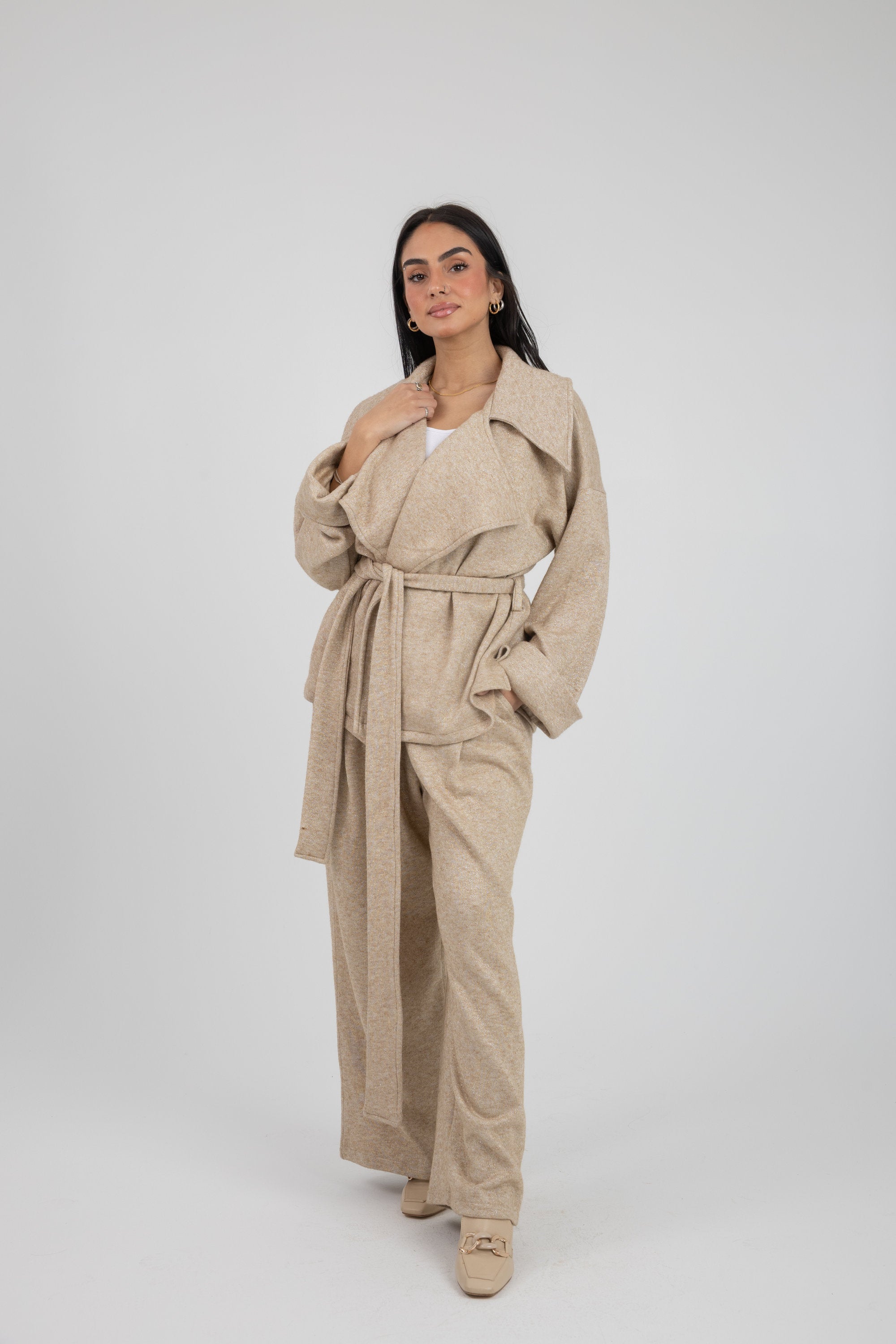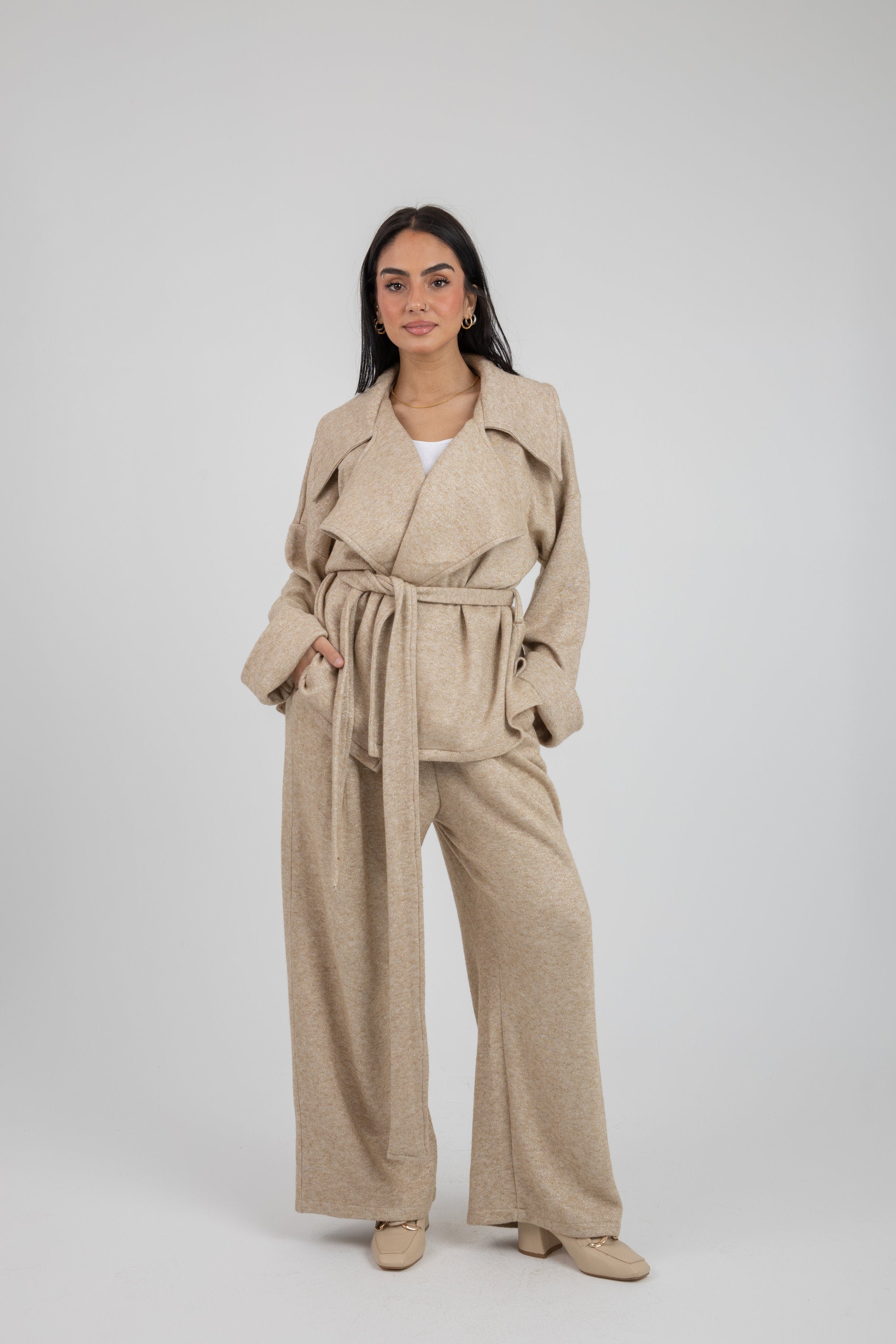 The Grace Set is a sophisticated two-piece ensemble featuring a Metallic knit material that adds a subtle, elegant shimmer. This set includes a belted wrap-style top and matching wide-leg trousers, designed to create a fluid and refined silhouette. It offers a unique texture and a comfortable fit that balances style and ease perfectly.