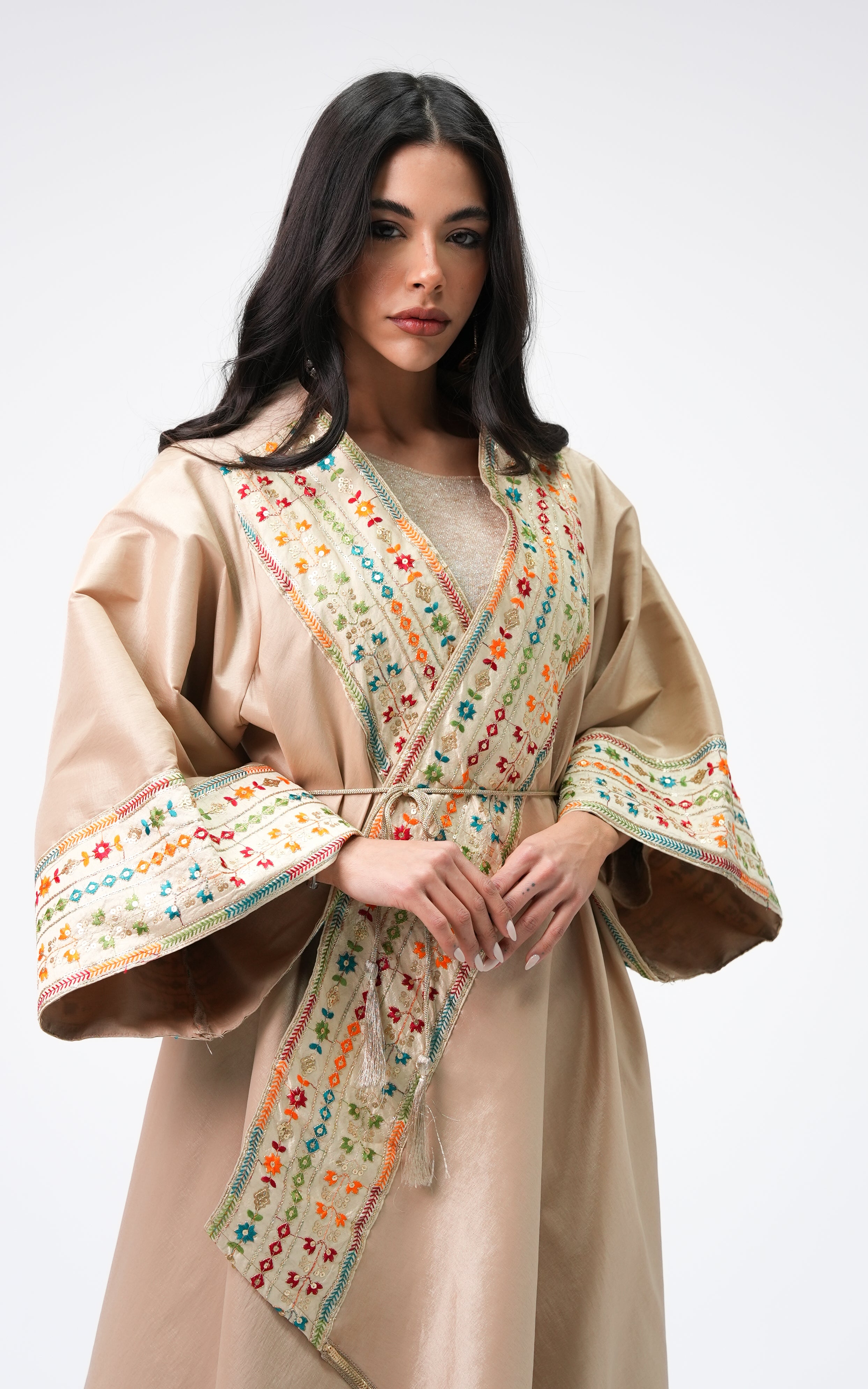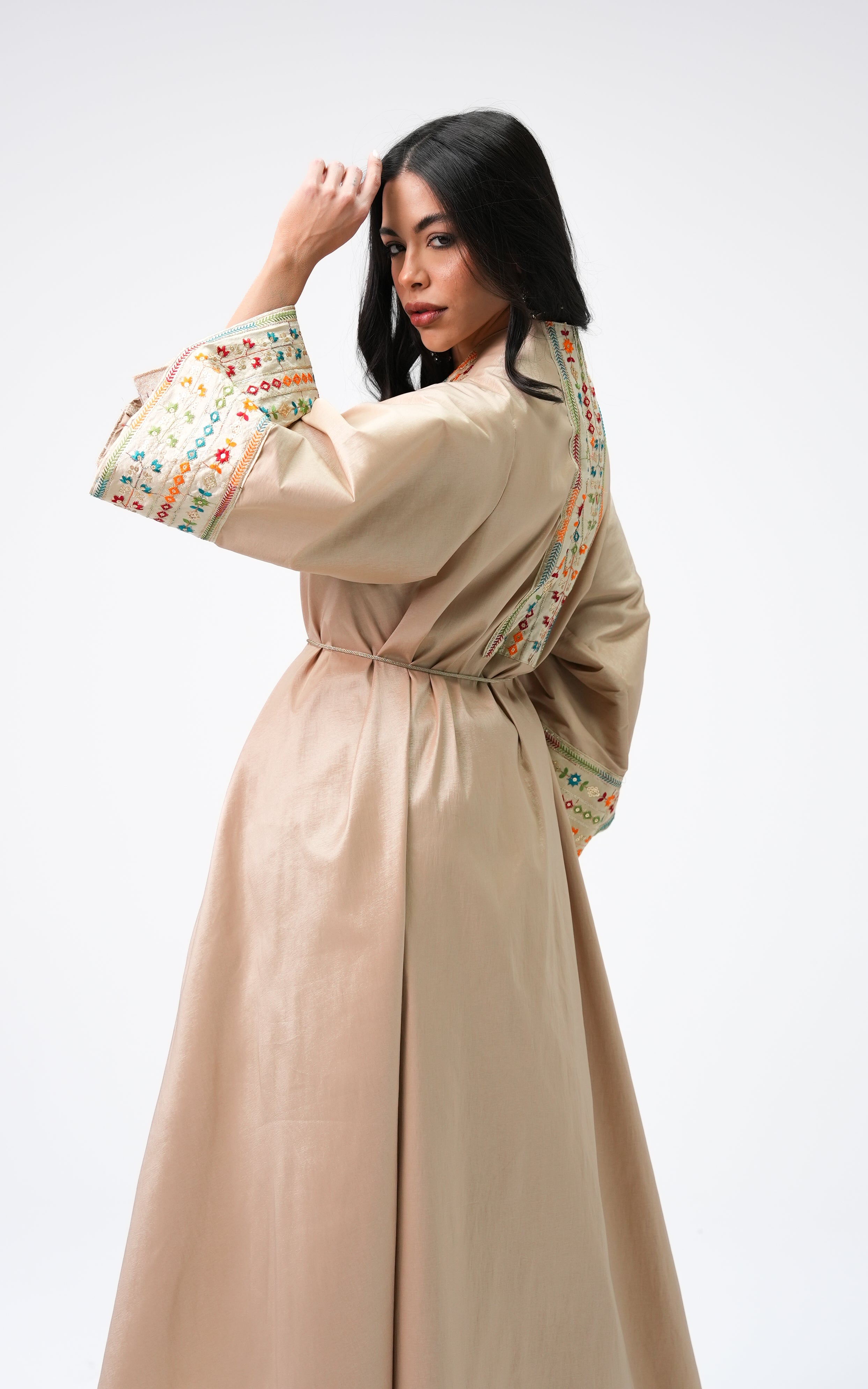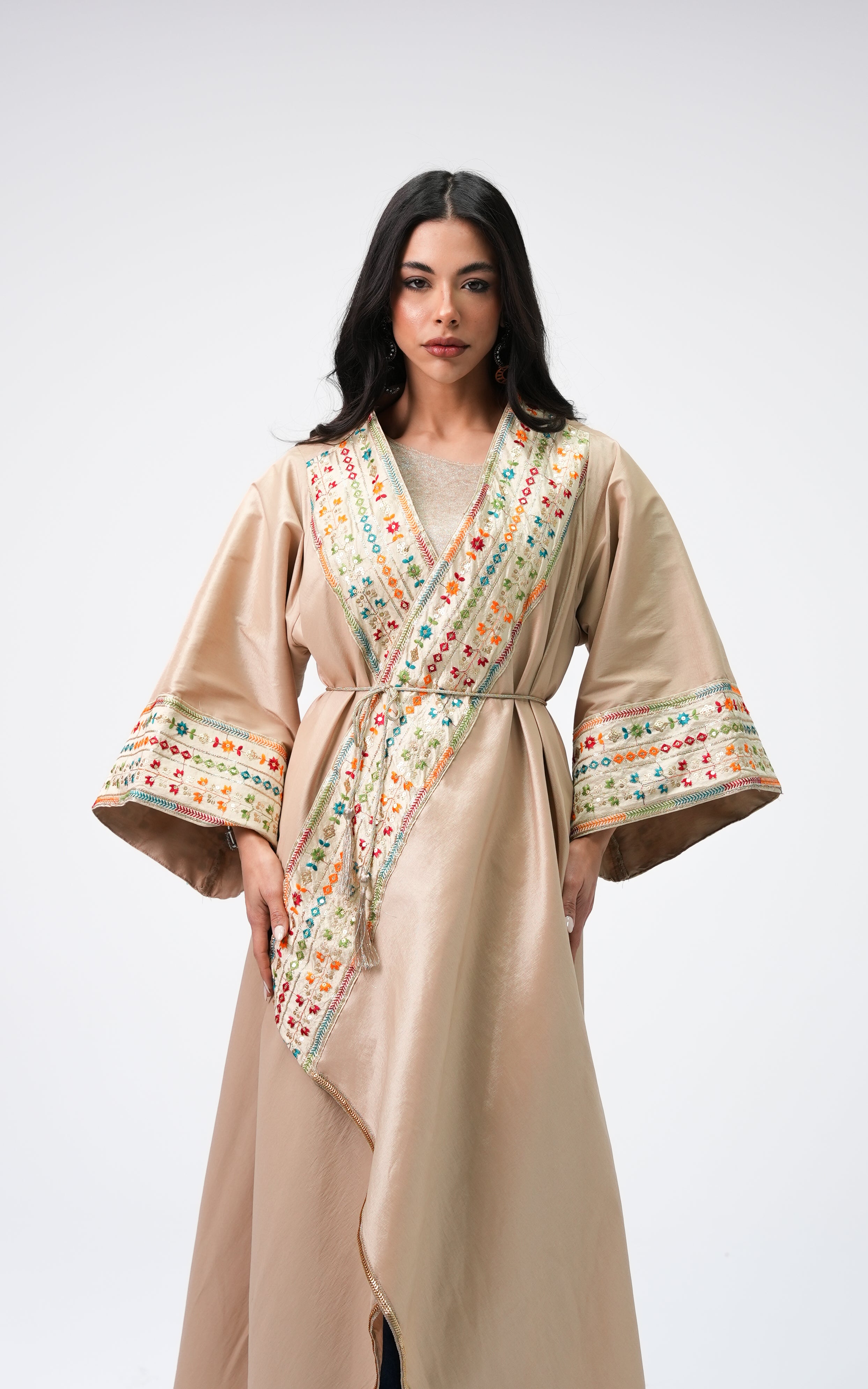 Hanyia is a taffeta dress featuring a flowing silhouette with embroidered detailing. Designed with wide sleeves and a graceful drape, it offers a refined and elegant look. FABRIC : Taffeta