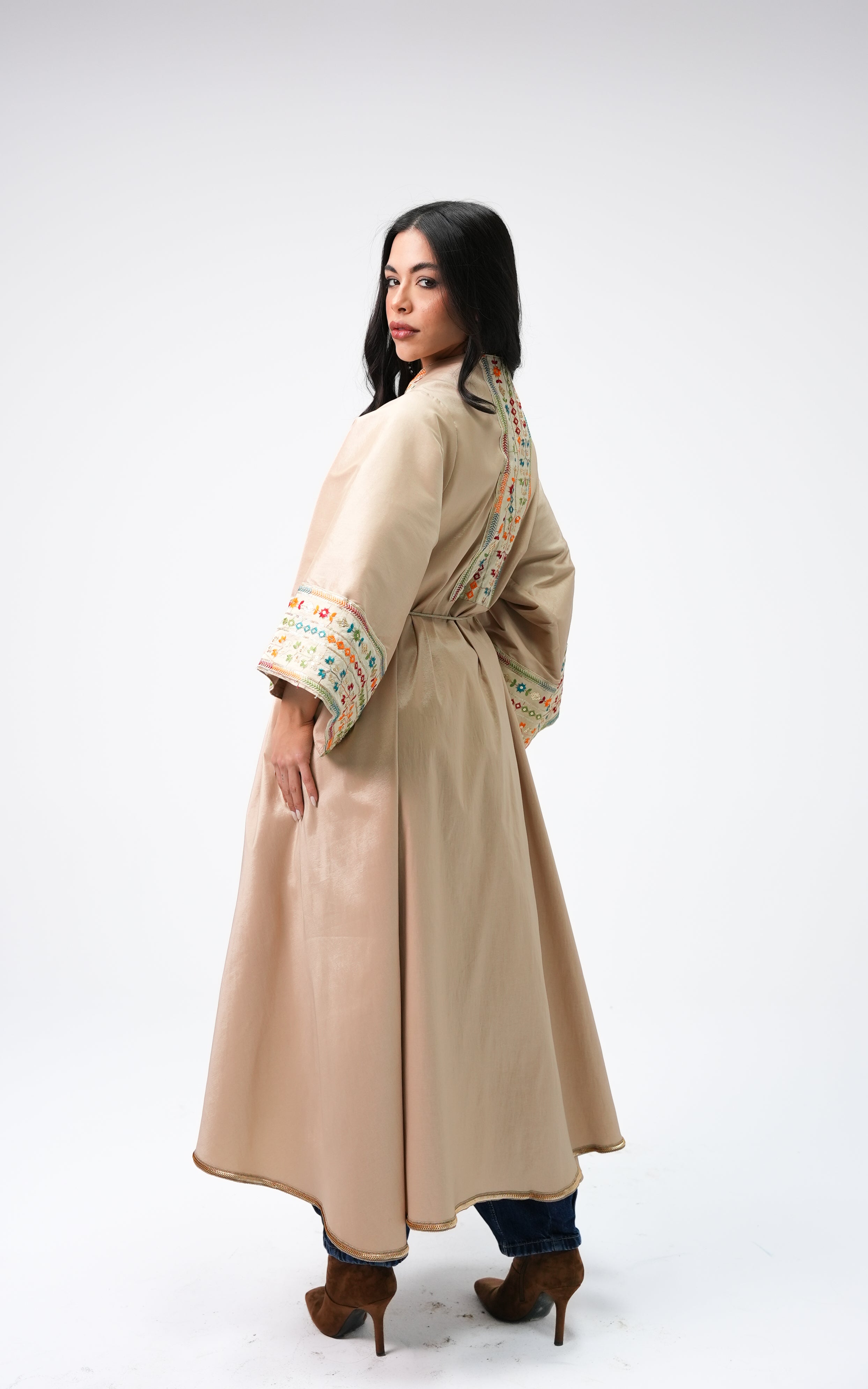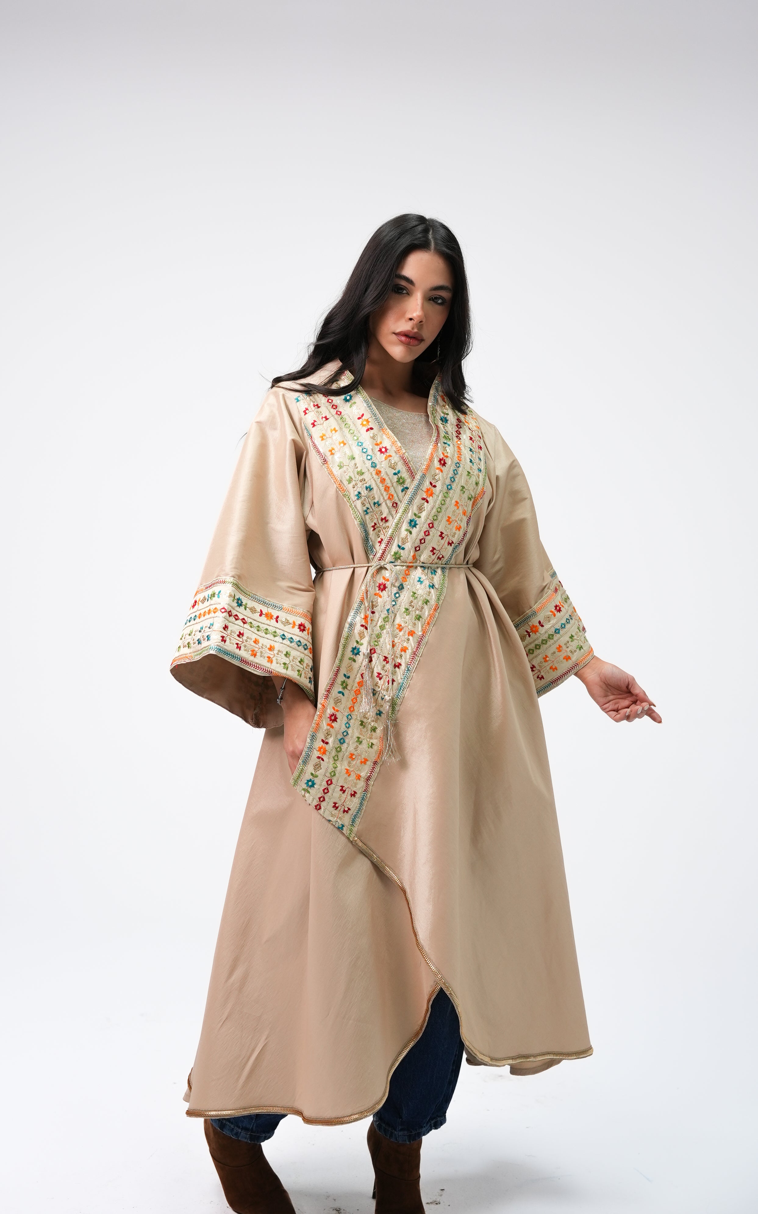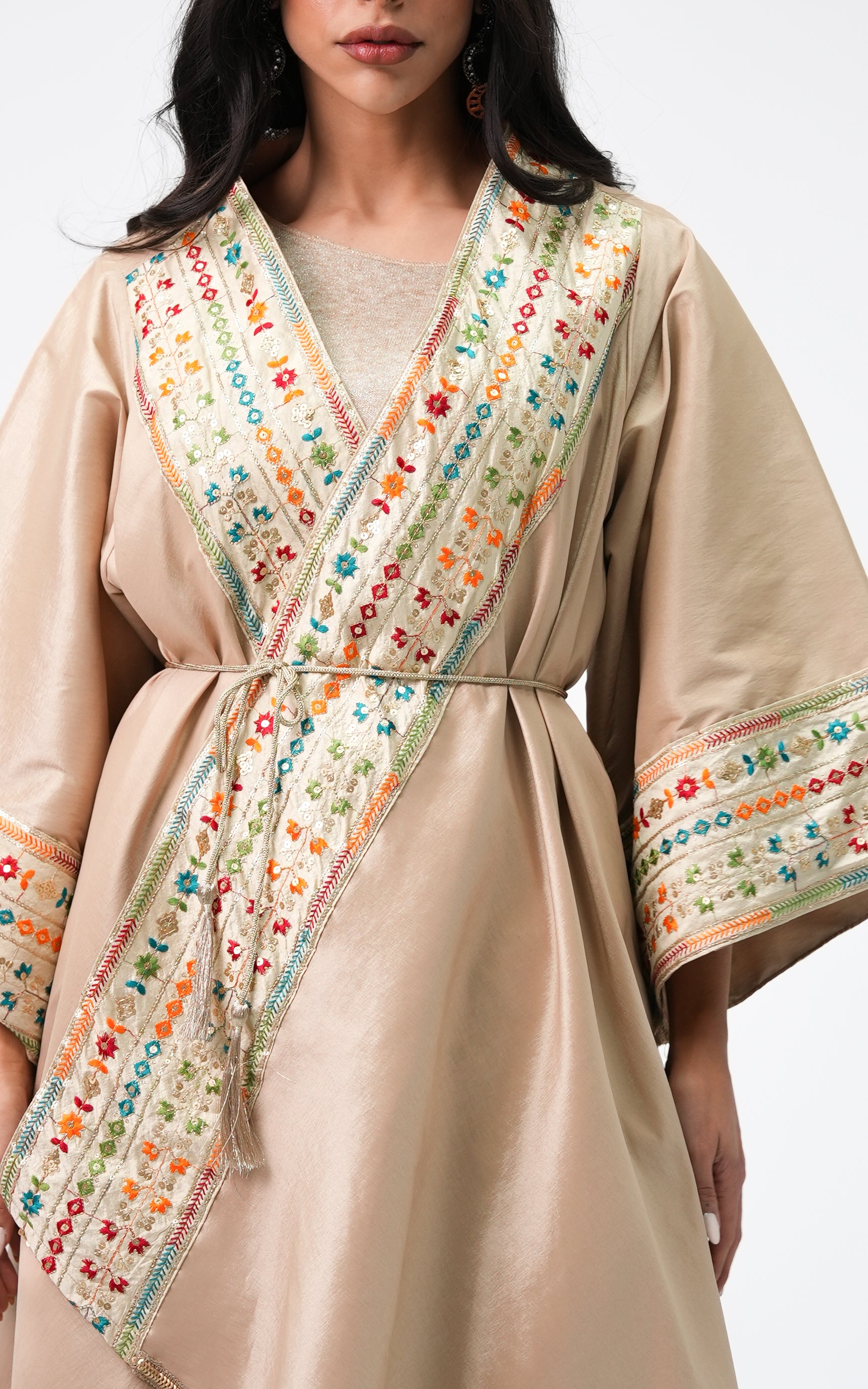 Hanyia is a taffeta dress featuring a flowing silhouette with embroidered detailing. Designed with wide sleeves and a graceful drape, it offers a refined and elegant look. FABRIC : Taffeta