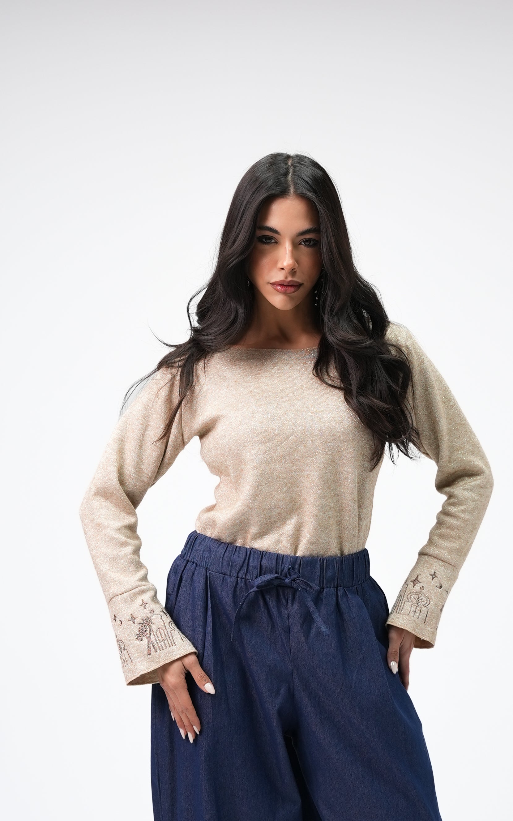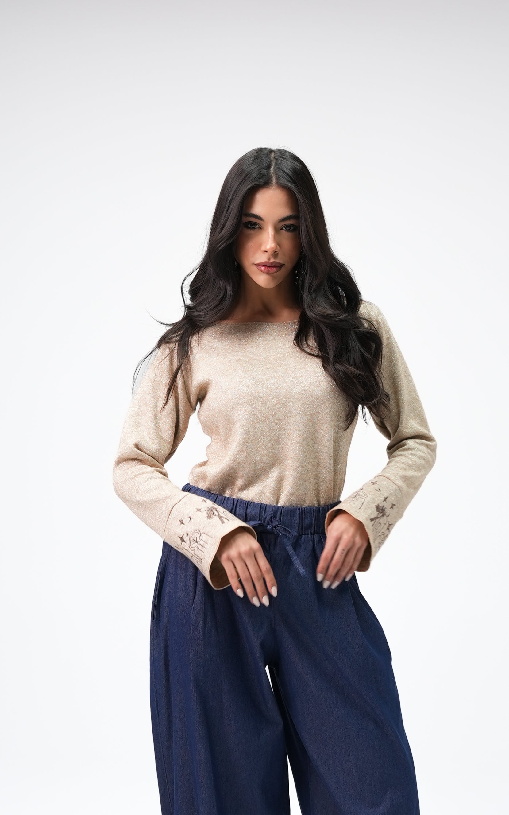 Naima is a tricot metallic top designed with a clean, relaxed silhouette. Featuring delicate sleeve detailing and a soft drape, it offers subtle shine and an elegant, refined look.