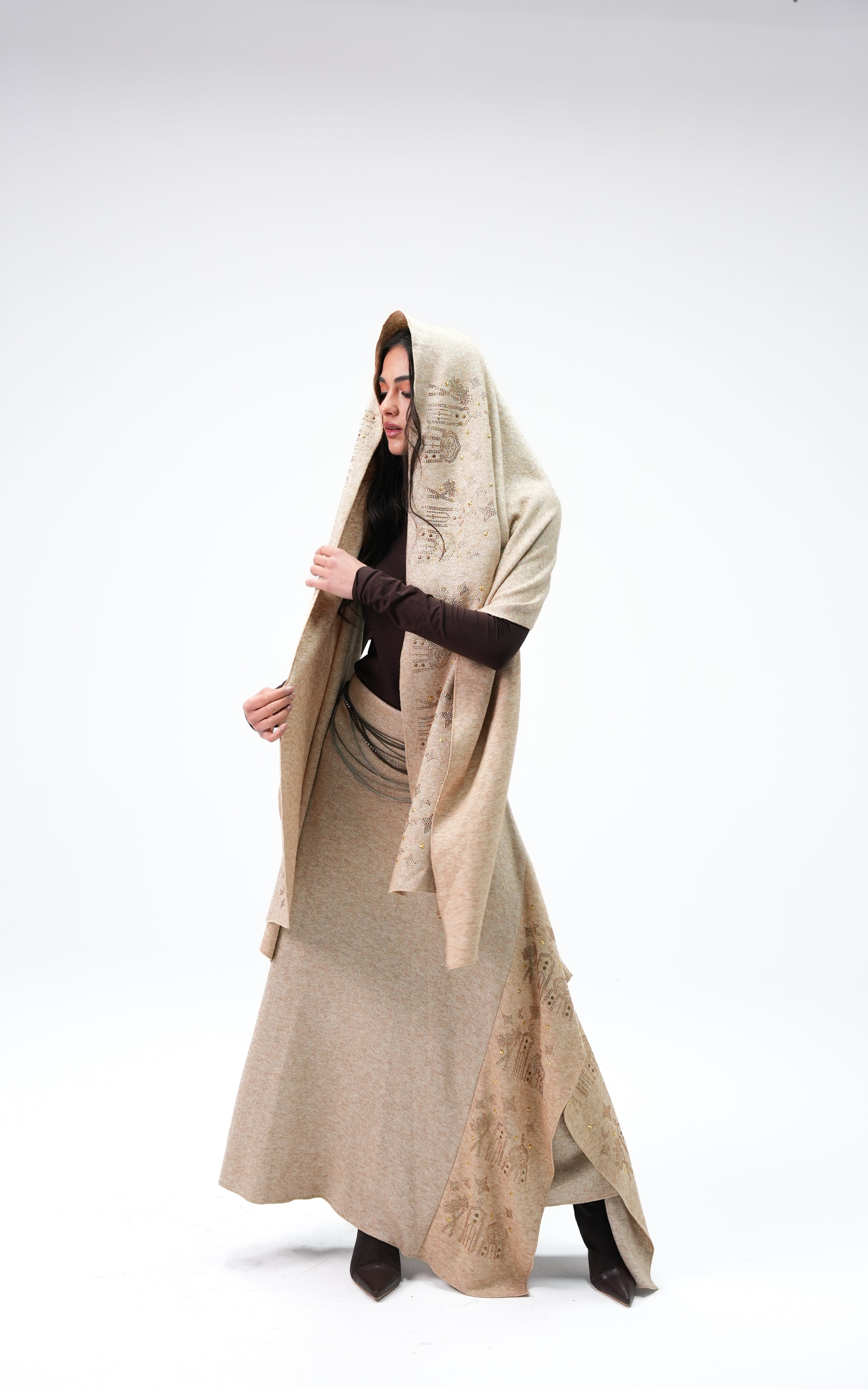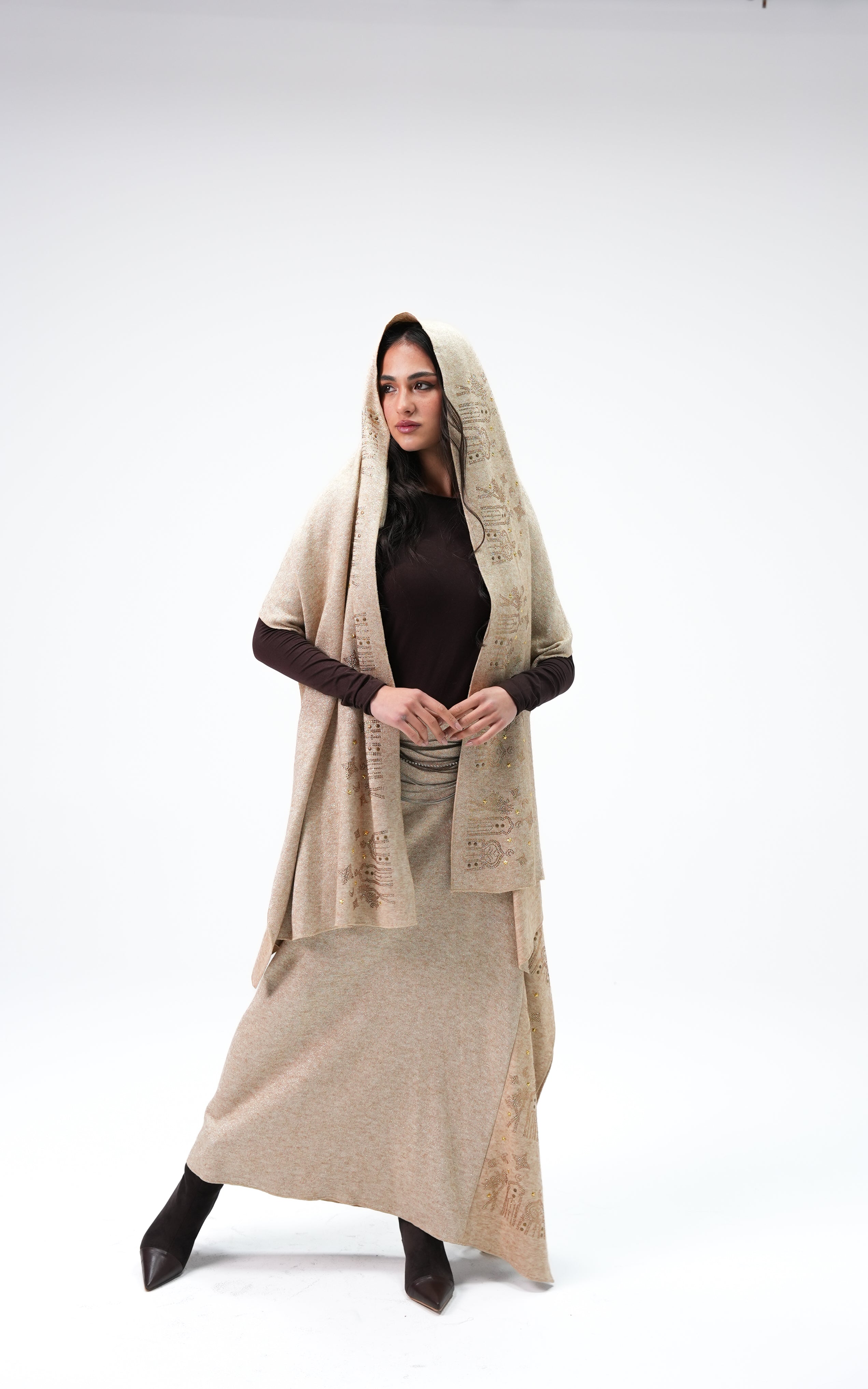 Nawara is a tricot metallic dress cardigan featuring a relaxed, flowing fit. Made from soft knit metallic fabric, it offers subtle shine, easy layering, and comfortable everyday wear.