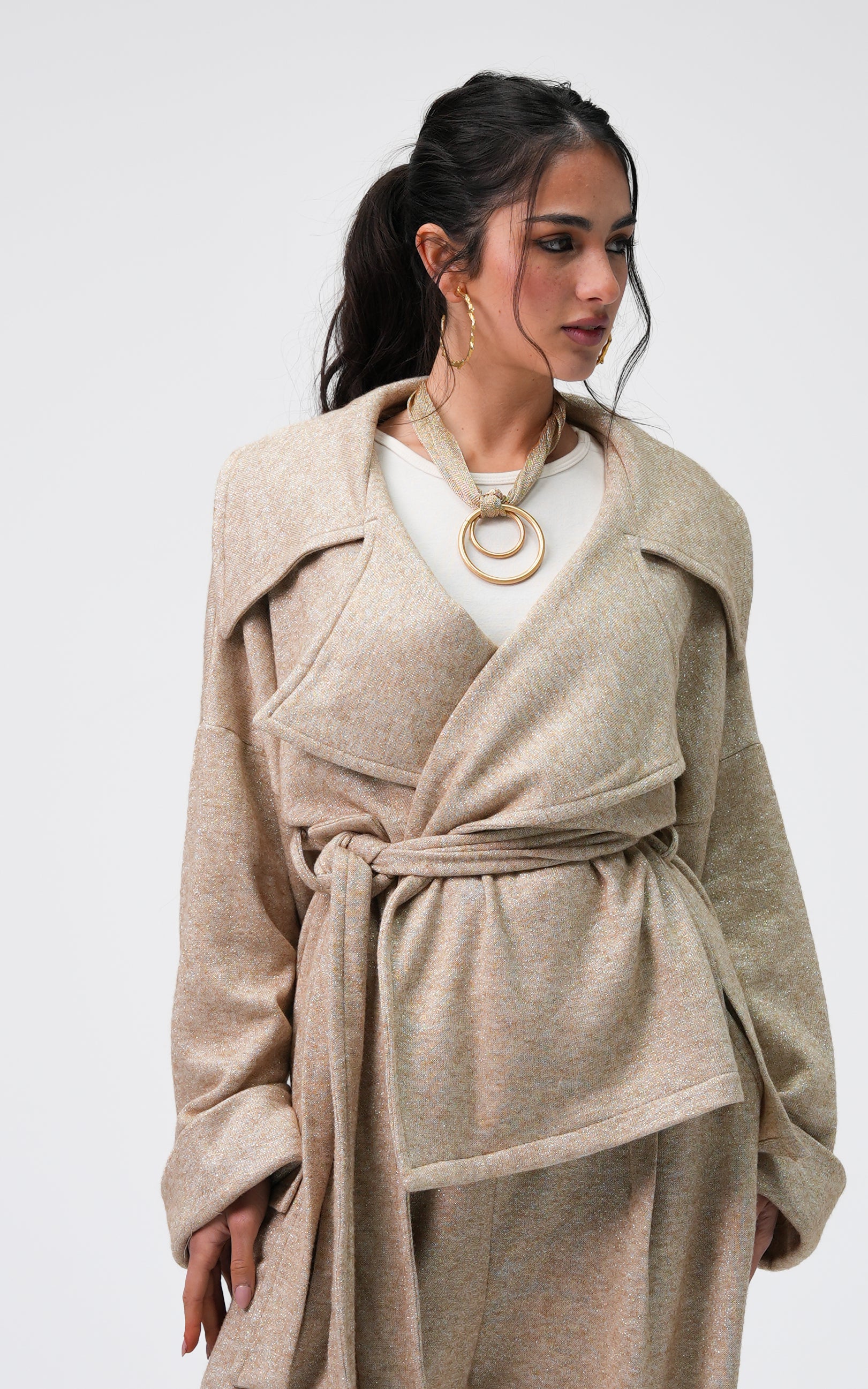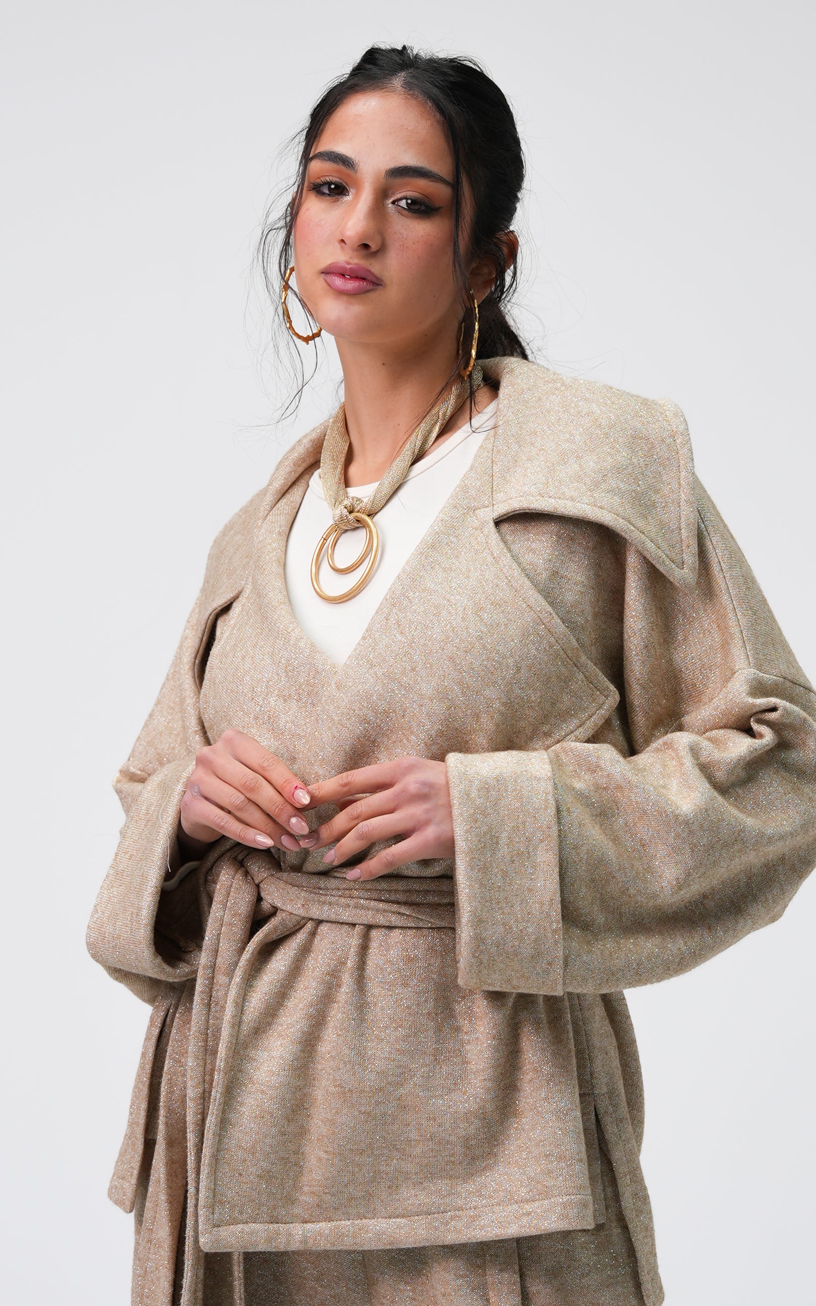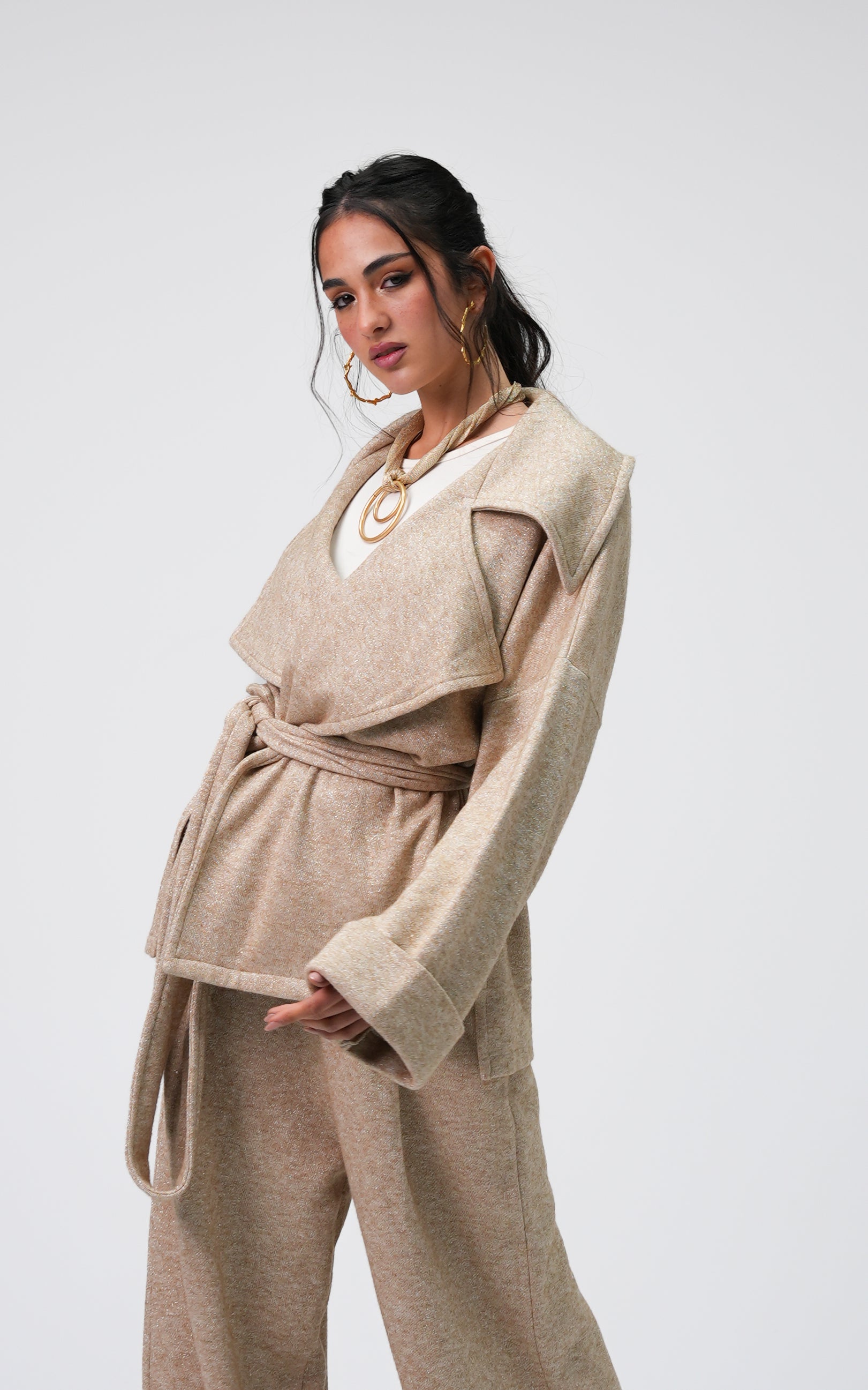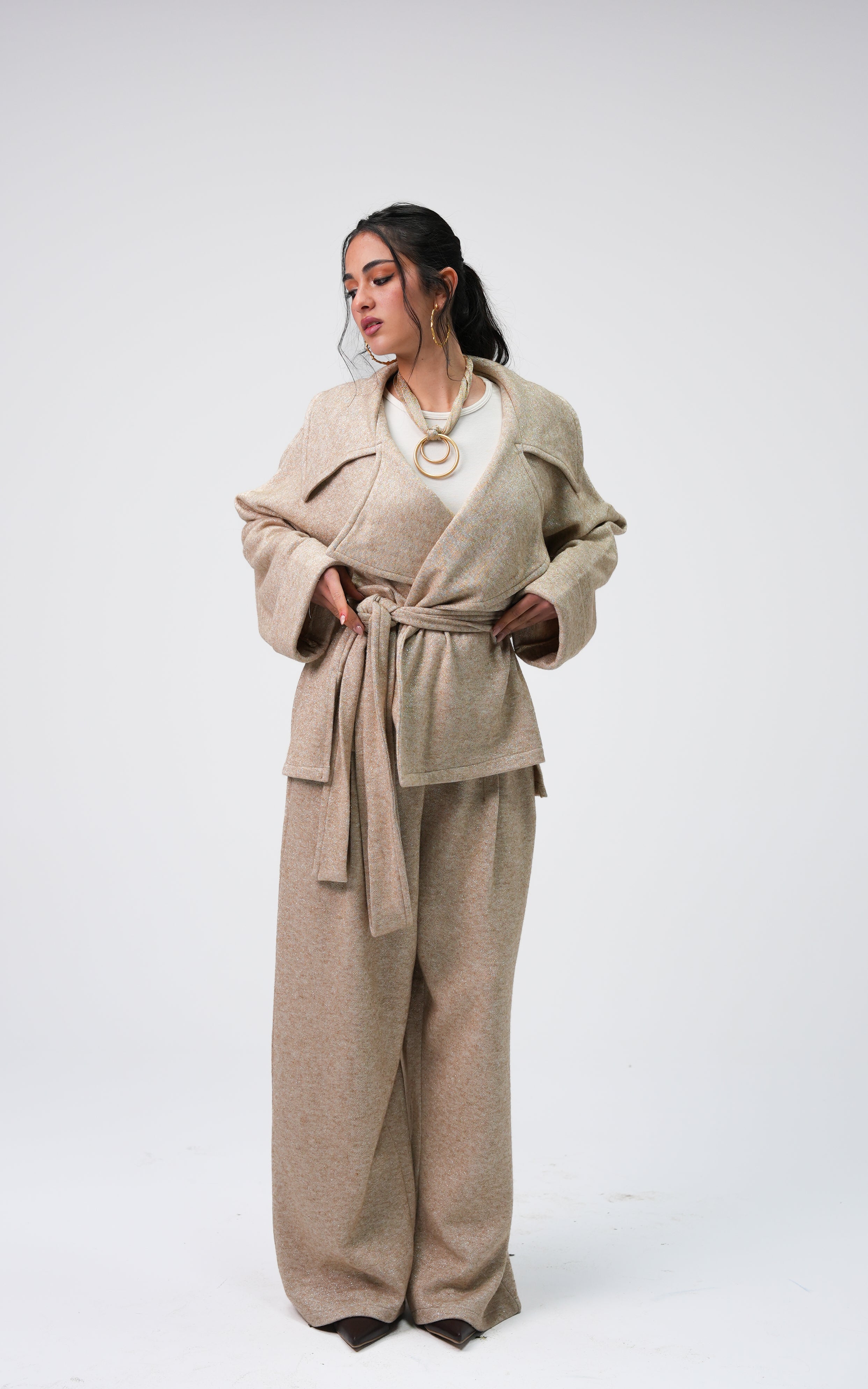 Zenat is a tricot metallic set featuring a relaxed, flowing silhouette. Designed with a belted jacket and wide-leg pants, it offers subtle shine and a clean, refined look.